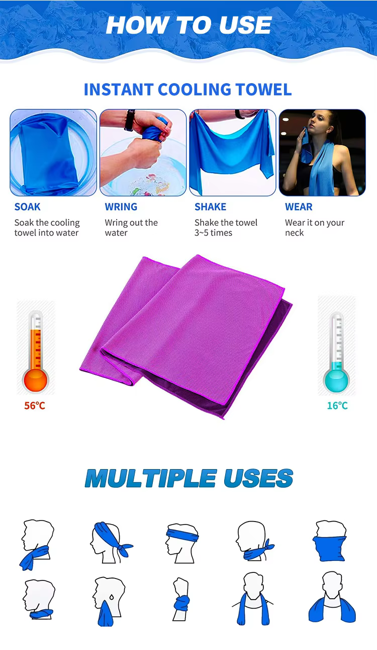 A cooling towel is a versatile fabric designed to provide instant and prolonged relief from heat. Made from advanced, super-absorbent materials, it works through evaporative cooling. Simply soak it in water, wring it out, and snap it to activate. As the water evaporates from the fabric, it draws heat away from your skin, lowering your body temperature. It’s reusable, portable, and essential for athletes, outdoor workers, and anyone seeking a quick cool-down on hot days.
